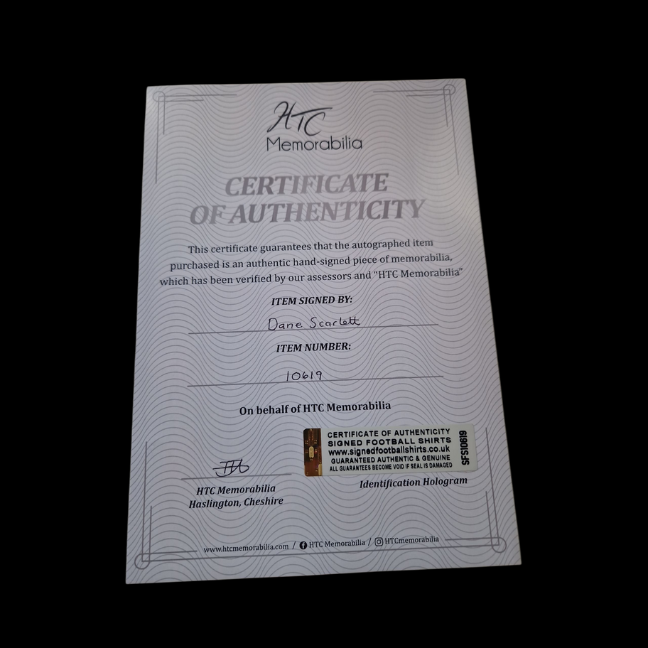 Scarlett is a centre-forward with excellent off-the-ball movement and positional skills, as well as good athletic attributes, this 2024–25 football shirt was personally hand signed by Dane Scarlett.