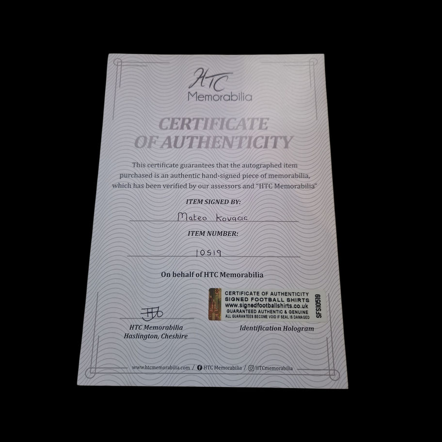 Kovačić has been described as a great technician with excellent dribbling abilities. He is considered to be a versatile midfielder, having played in different midfield positions, he currently plays as a central midfielder for Premier League club Manchester City and the Croatia national team. this 2023-24 football shirt was personally hand signed by Mateo Kovacic.