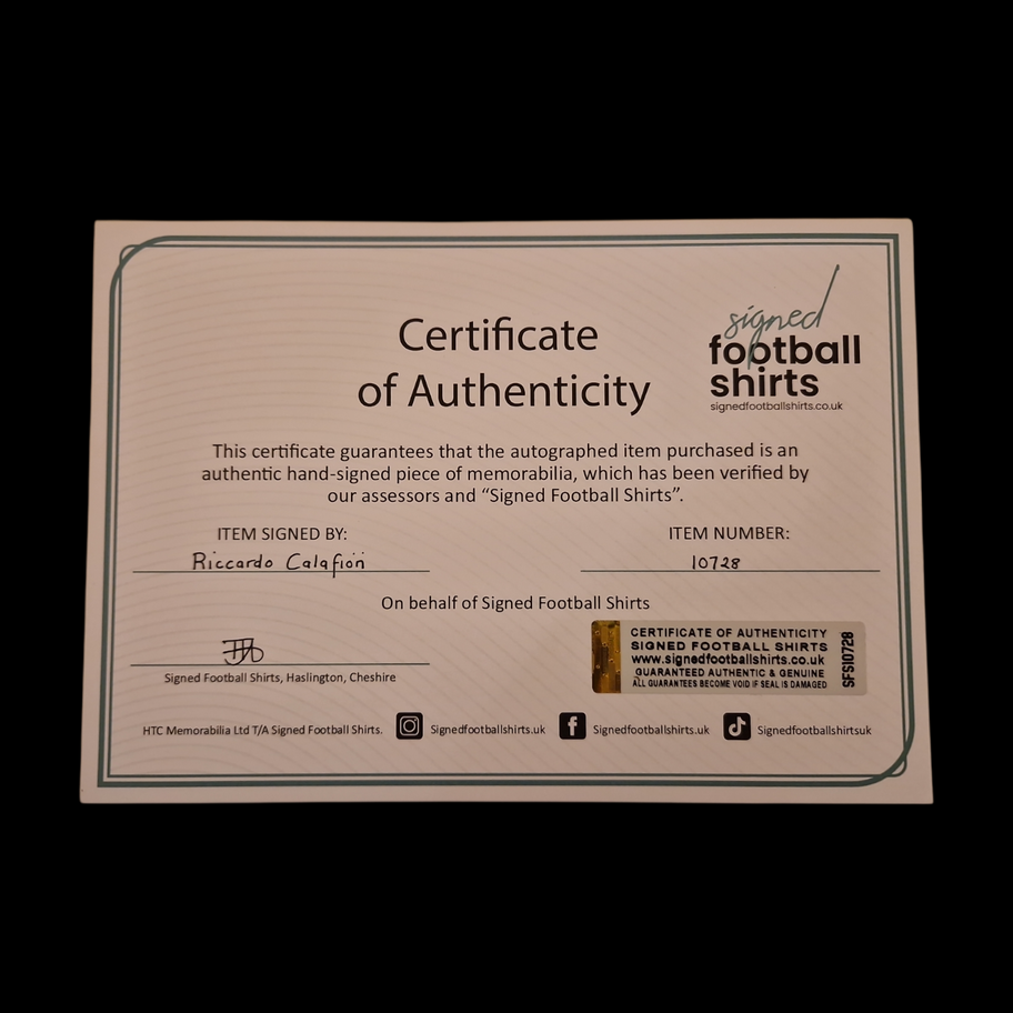 In July 2024, he joined Premier League club Arsenal for an initial fee of £33.6 million, this 2025–26 football shirt was personally hand signed by Riccardo Calafiori.