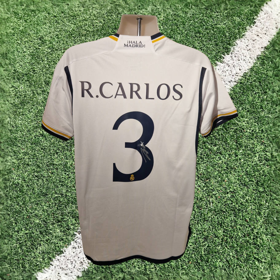 Often referred to as RC3, is a former professional footballer known for his exceptional skills as a left-back. His career at Real Madrid and with the Brazilian national team has left an indelible mark on the sport, this 2023–24 football shirt was personally hand signed by Roberto Carlos.